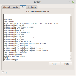 1. masuk interface, ketikkan int fa0/???? atau bisa menggunakan perintah ini untuk memasukkan lebih dari satu int secara langsung, int range fa 0/x - x